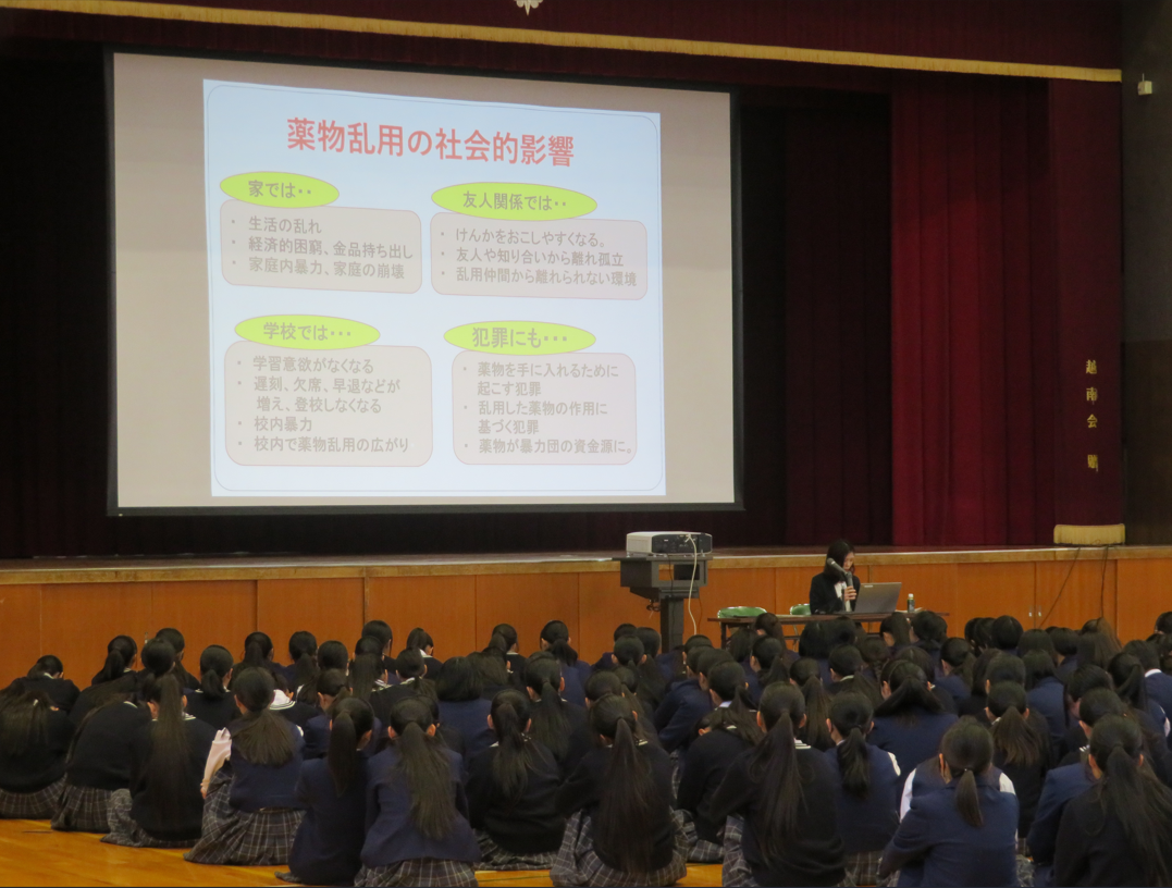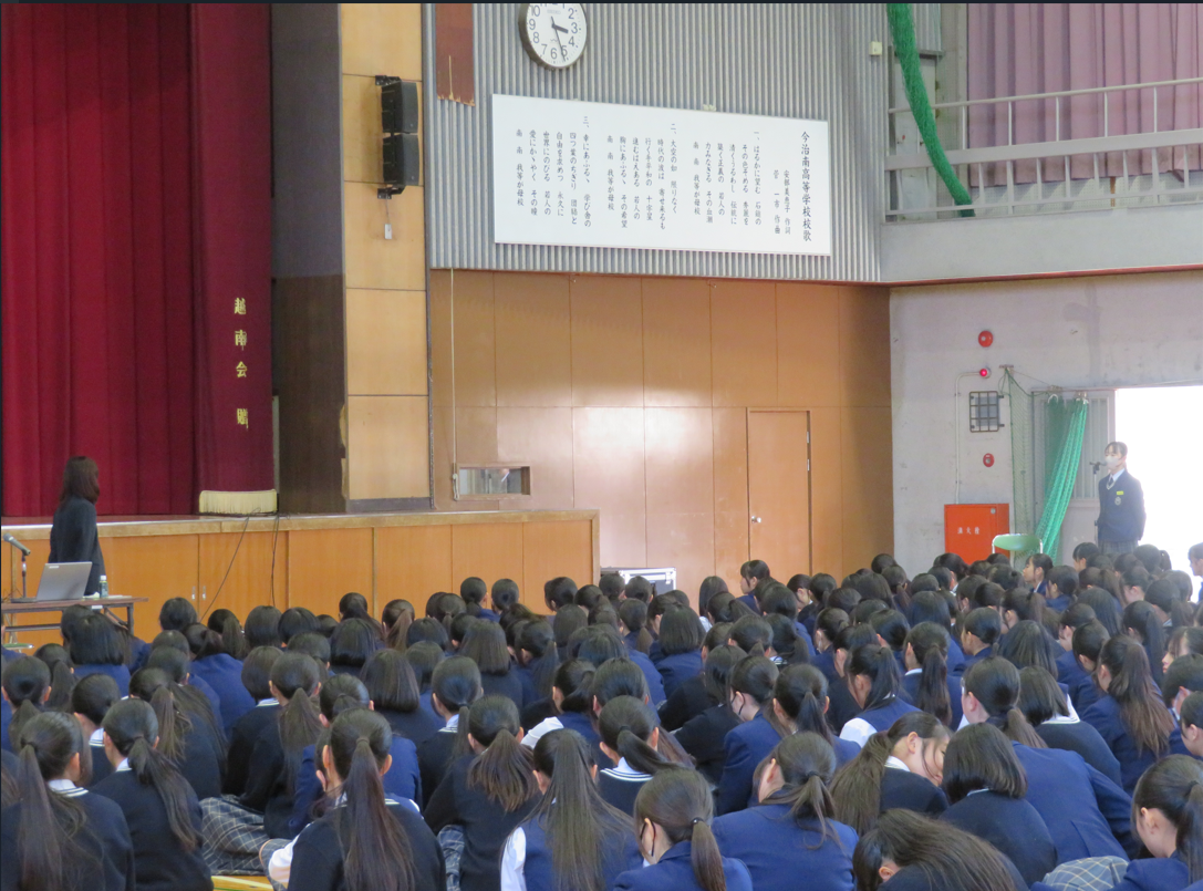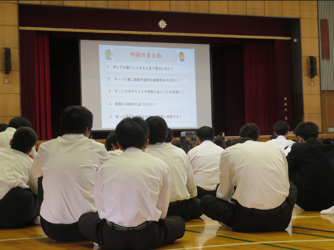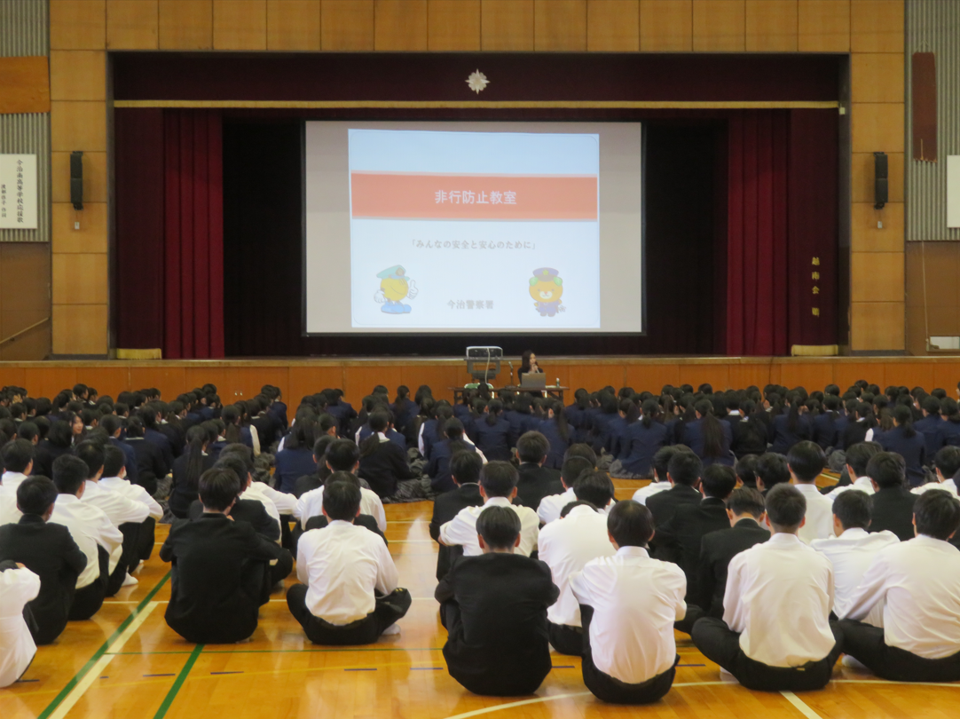 本日6限目に、今治警察署生活安全課少年係より講師の先生を招いて非行防止教室を行いました。SNSによるトラブルや薬物乱用など、生徒に身近な内容で大変勉強になったのではないでしょうか。被害に遭わないよう、今日の講演内容を一人ひとりが自分事として捉えて、今後に生かしてほしいものです。